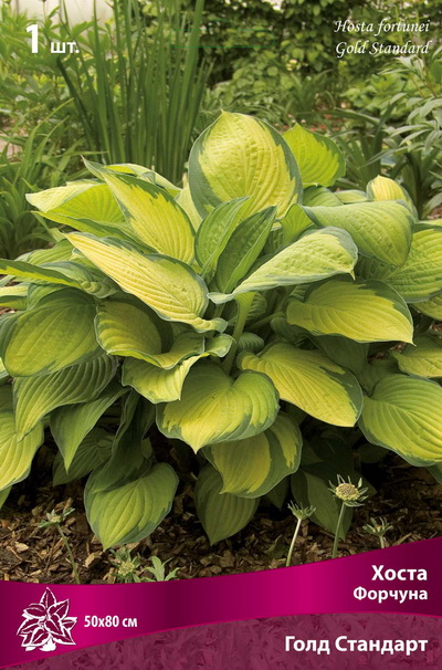 Голд Стандарт - высота куста 50 см, ширина 80 см, листья вначале зеленые с темно-зеленым краем, летом центр листа становится золотистым, цветки лиловые.